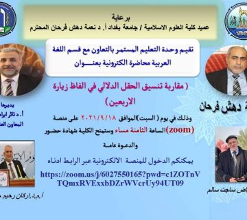 قسم اللغة العربية ينظم محاضرة بشأن الزيارة الأربعينيةCois25/09/2021نظم قسم اللغة العربية في كلية العلوم الإسلامية محاضرة بعنوان (مقاربة تنسيق الحقل الدلالي في ألفاظ زيارة الاربعين)، تعاقب على...المزيد