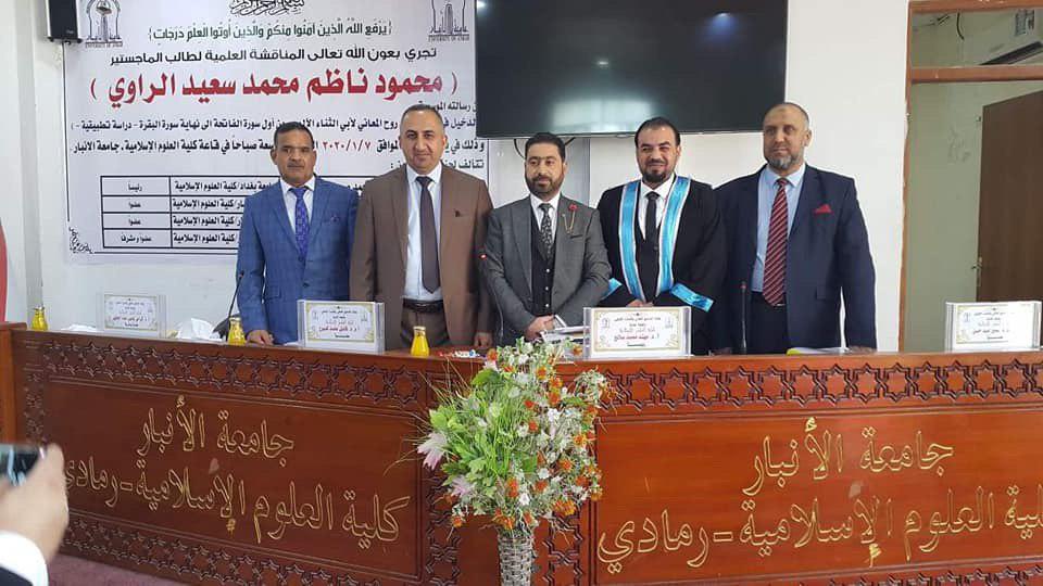 تراس الاستاذ الدكتور مهند محمد صالح التدريسي في كلية العلوم الاسلامية بجامعة بغداد لجنة مناقشة رسالة ماجستير في كلية العلوم الاسلامية بجامعة الانبار وكانت بعنوان (الدخيل في التفسير في روح المعاني لابي الثناء الالوسي من اول سورة الفاتحة الى نهاية سورة البقرة ) والتي اجيزت بتقدير مستوفٍ من قبل لجنة المناقشة.