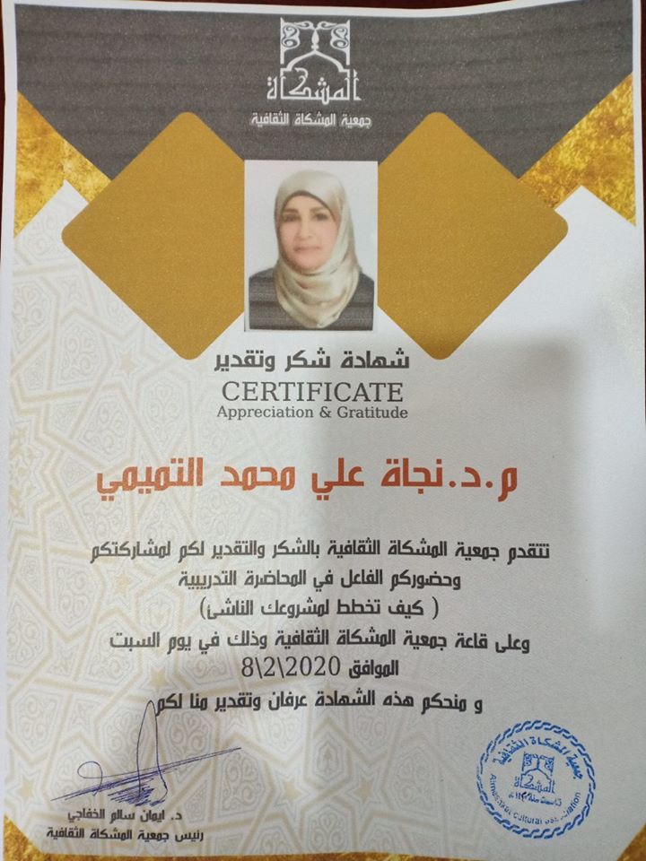 شاركت الدكتورة نجاة علي التميمي التدريسية في قسم الحضارة الاسلامية في كلية العلوم الاسلامية بجامعة بغداد بالمحاضرة التدريبية كيف تخطط لمشروعك الناشئ التي نظمتها جمعية المشكاة الثقافية بالتعاون مع منصة نقطة عمل للأستشارات والخدمات التجارية والصناعية وتعتبر هذه المحاضرة فرصة لأصحاب المؤسسات والمشاريع الناشئة و رواد الأعمال والداخلين في سوق المنافسة حديثا” بالاضافة الى المتخرجين الجدد والطامحين بتطوير قدراتهم وأفكارهم الريادية وسيتمكن المشاركون من أكتساب المعارف في المواضيع التالية: تعريف المشروع الناشئ و دراسة السوق المستهدف التخطيط والتحليل الاستراتيجي للمشروع والمنافسين في السوق و كيفية حساب الكلف التقديرية للمشروع و آليات اختيار استراتيجيات التسويق الملائمة للمشروع وقد القى محتواها المحاضرحسنين محمد حسن مهندس أستشاري ومدون ألكتروني له خبرة أكثر من خمسة عشر عاما” في العمل المهني والأكاديمي .