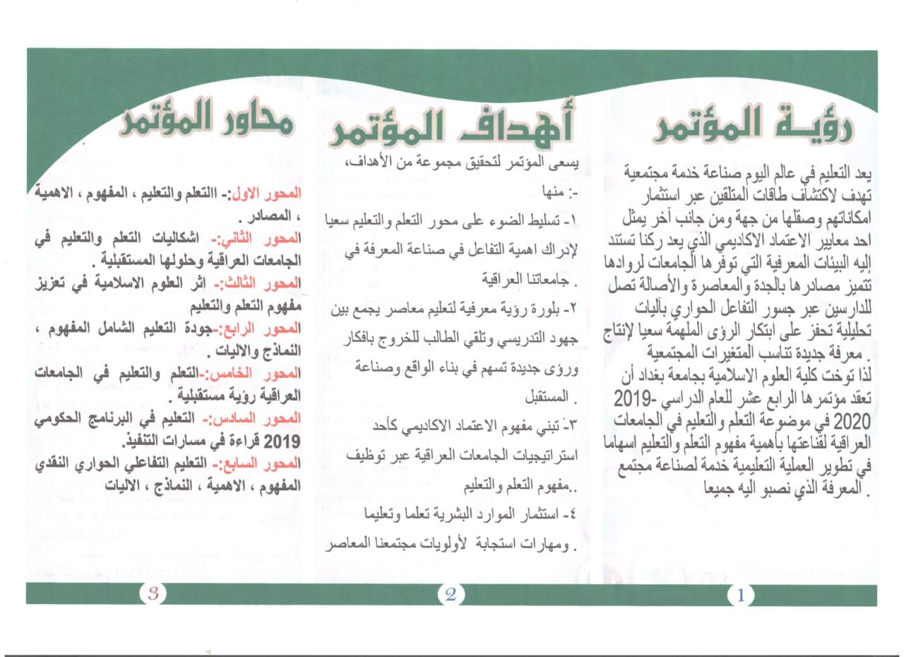 ستقيم كلية العلوم الاسلامية مؤتمرها العلمي الرابع عشر فعلى الباحثين الراغبين في الاشتراك الاطلاع على جميع التفاصيل من شروط الاشتراك واهداف ومحاور المؤتمر في مطوية المؤتمر ادناه :