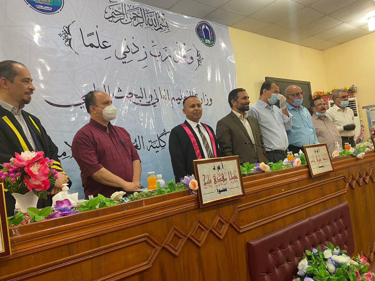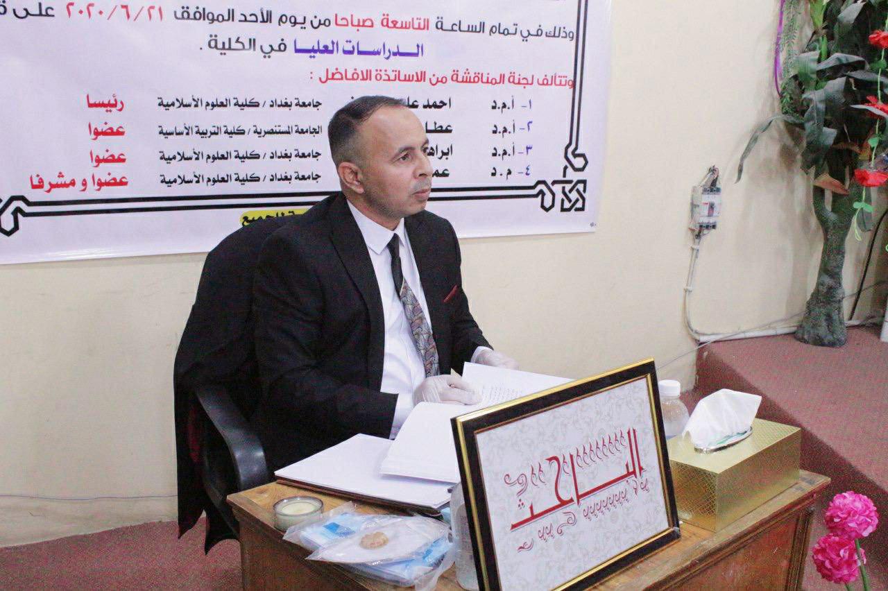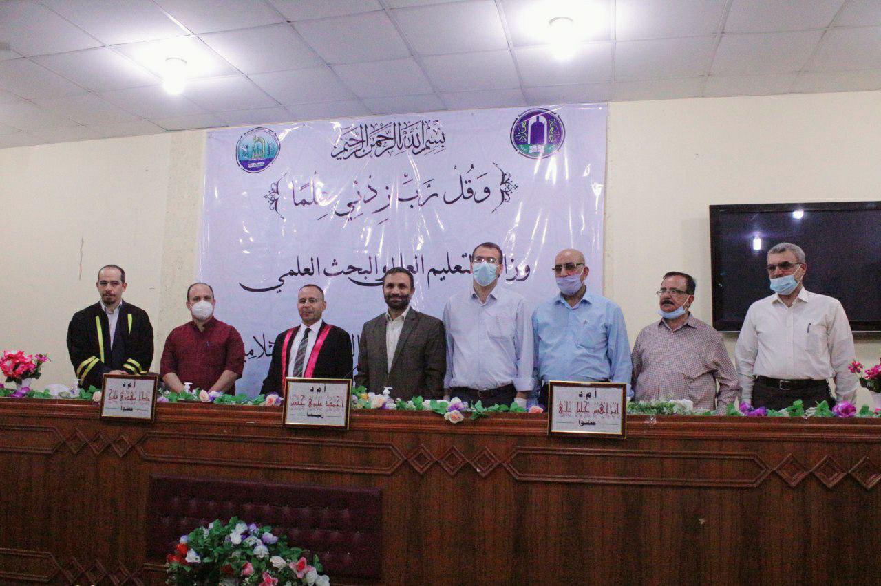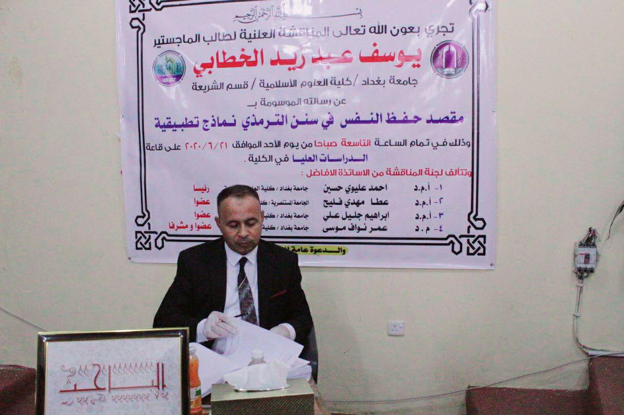 ناقشت كلية العلوم الاسلامية بجامعة بغداد رسالة ماجستير على قاعة (( أهل البيت عليهم السلام )) بمبنى كلية العلوم الاسلامية، للطالب (يوسف عبد زيد صياح ضاحي الخطابي) ، الموسومة (مقصد حفظ النفس في سنن الترمذي – نماذج تطبيقية).