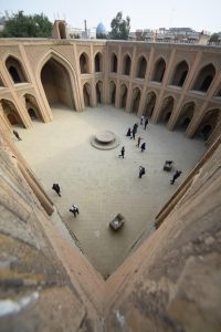 الورشة حاضرت فيها التدريسية بقسم الحضارة والآثار الإسلامية الدكتورة نجاة علي محمد التميمي، وبحضور عدد من أساتذة القسم وطلابه، وقد عرضت فيها إلى التسميات التي أطلقت على المبنى منها : “المدرسة الشرابية ” المدرسة الشرفية ” و”دار المسناة”، وبينت أنه لا يعرف على وجه التحقيق، الغرض الذي شيدت من أجله العمارة المعروفة الى اليوم. وأن كل ما ثبت للباحثين انه بناية تعود إلى العصر العباسي عباسية 132-656 هجرية، التي تدل آثارها الباقية على فخامتها، وجمالها، وروعة هندستها، وزخرفتها. ولم يعرف مَنْ أنشأها، ولا التاريخ الذي انشئت فيه. لانه لم يتسن للعلماء والباحثين الوقوف على التفاصيل التاريخية التي تمكنهم من معرفة حقيقتها وماهيتها؛ لان الأثر لم يشر إلى ذلك فضلا عن ندرة المراجع التاريخية عن بغداد في العصور المتأخرة.