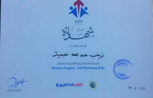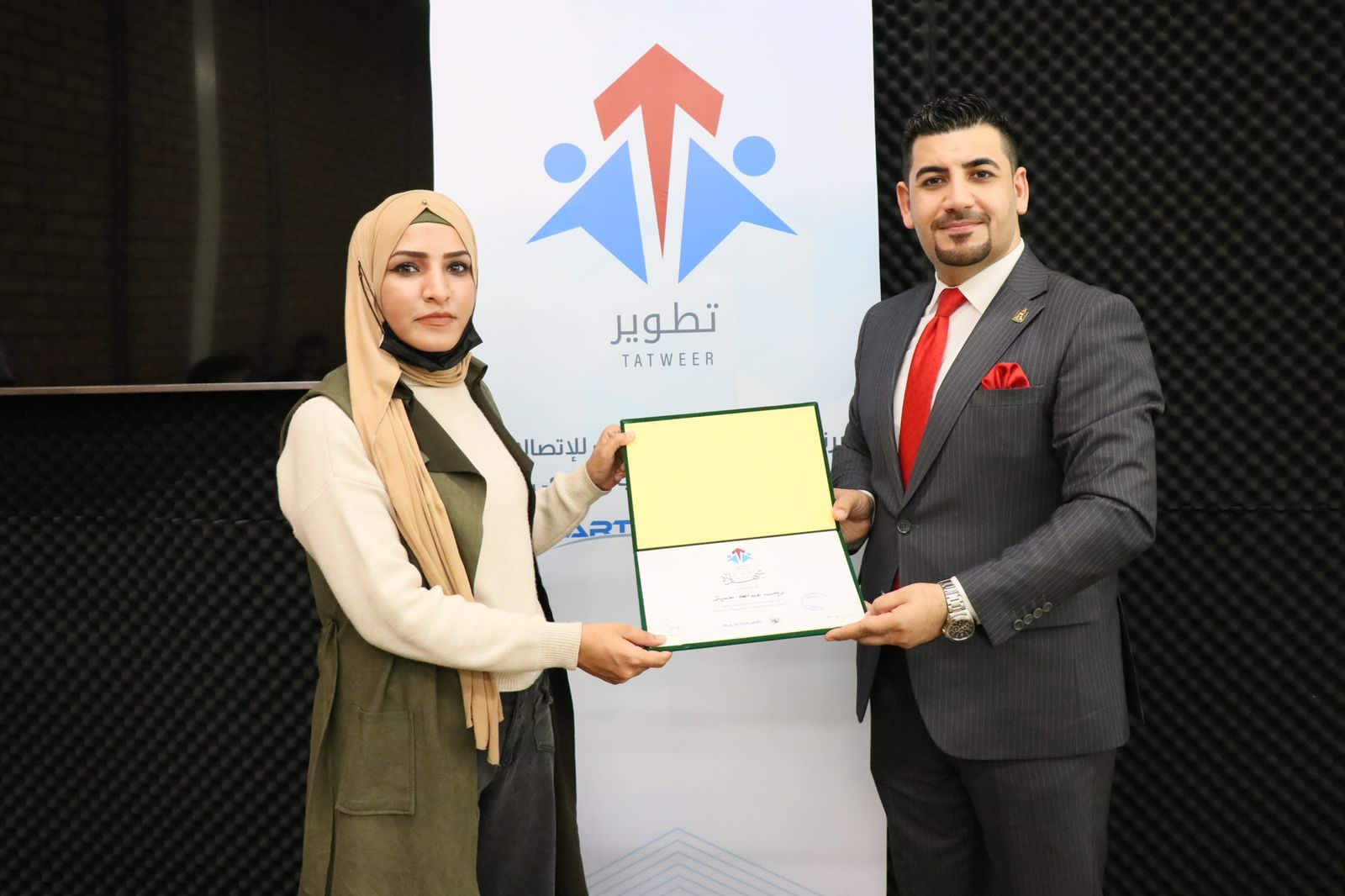 تكريم التدريسية زينب جاء بعد مشاركتها في الورشة 10 من مشروع ( تطوير ) الذي يقيمه مركز ايلاف للتدريب الإعلامي بالتعاون مع شركة ايرثلنك للاتصالات، والتي تتضمن مفردات متعدزة مثل كيفية كتابة السيرة الذاتية والمقابلات الوظيفية والتسويق الشخصي والتسويق الاجتماعي.