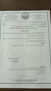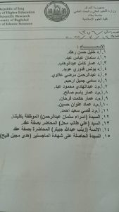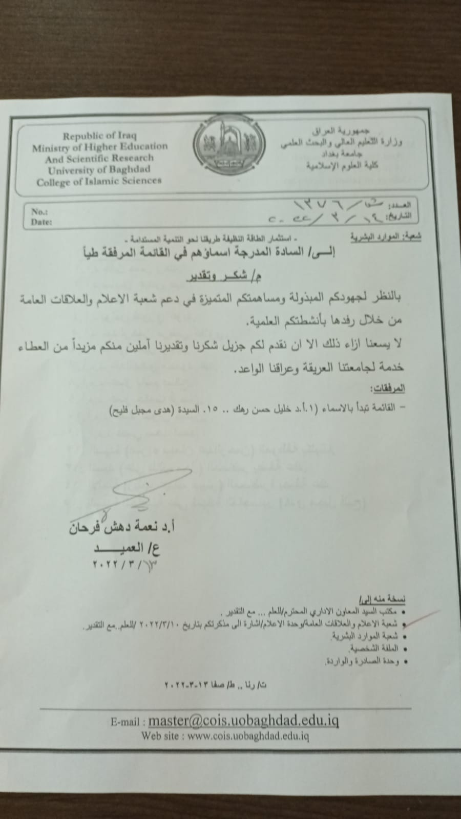 وجّه الأستاذ الدكتور نعمة دهش فرحان عميد كلية العلوم الاسلامية بجامعة بغداد كتاب شكر وتقدير الى نخبة خيرة من التدريسيين في الكلية ، وذلك لجهودهم المبذولة ومساهمتهم المتميزة في دعم شعبة الاعلام والعلاقات العامة من خلال رفدها بأنشطتهم العلمية املاً منهم مزيداً من العطاء خدمة لجامعتنا العريقة .