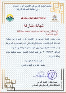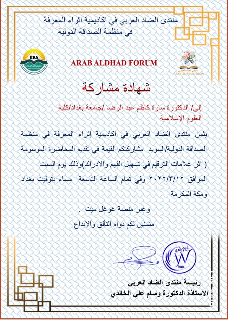 ألقت الدكتورة سارة كاظم عبد الرضا التدريسية في قسم العقيدة والفكر الإسلامي في كلية العلوم الاسلامية بجامعة بغداد ، محاضرةبعنوان (اثر علامات الترقيم في تسهيل الفهم والإدراك) في منتدى الضاد العربي في أكاديمية إثراء المعرفة في منظمة الصداقة الدولية /السويد .