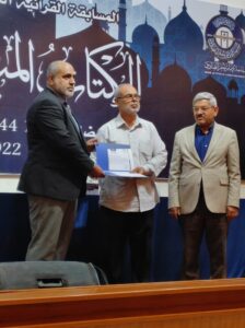مشاركة عميد العلوم الإسلامية تمثل في حضوره الحفل الختامي للمسابقة، كذلك بتوزيع كتب المشاركة للفائزين في المسابقة التي تنافس بها عدد من الطلبة من كليات وجامعات مختلفة.