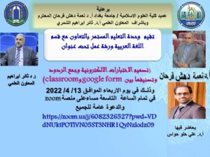 اقامت وحدة التعليم المستمر بالتعاون مع قسم اللغة العربية ورشة عمل بعنوان (تصميم الاختبارات الالكترونية وجمع الردود وتصنيفها بين google classroom و form) بتاريخ 13/4/2022.