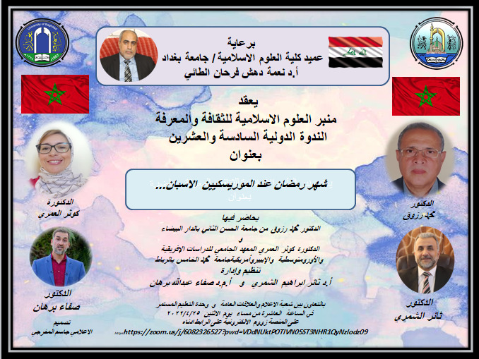 عقد منبر العلوم الإسلامية للثقافة والمعرفة ندوته الدولية الالكترونية ٢٦ تحت عنوان (شهر رمضان عند الموريسكيين الاسبان)، ضيف فيها كلا من الدكتور محمد رزوق والدكتورة كوثر العمري من المغرب، وذلك يوم الاثنين ٢٥/ ٤/ ٢٠٢٢م.
