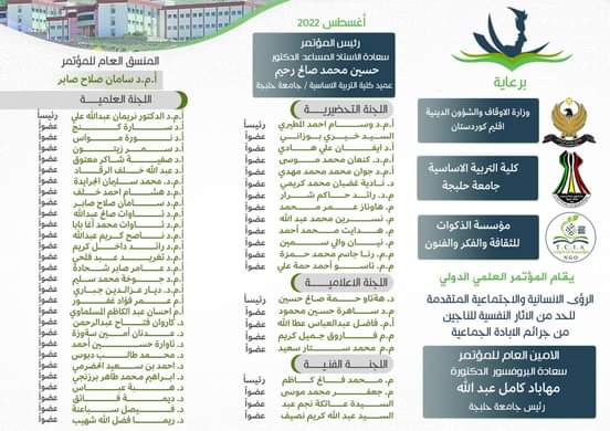 اختيرت التدريسية في كلية العلوم الاسلامية قسم الاديان المقارن الدكتورة رنا جاسم محمد عضوا في اللجنة التحضيرية في المؤتمر العلمي الدولي (الرؤى الانسانية و الاجتماعية المتقدمة للحد من الاثار النفسية للناجين من جرائم الابادة الجماعية للمدة17-18/ 8/ 2022في مدينة حلبجة – اقليم كوردستان العراق.