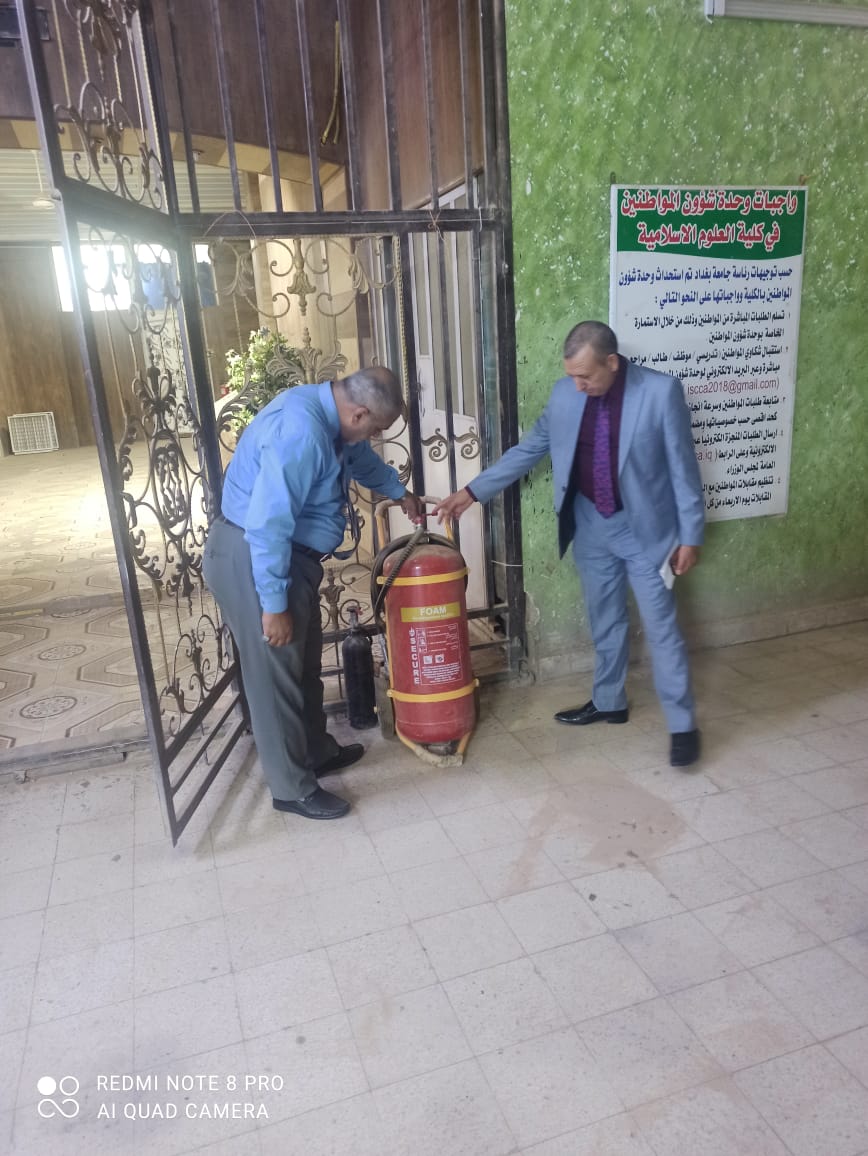 بتوجيه من رئيس جامعة بغداد الاستاذ الدكتور منير السعدي ، تفقد الاستاذ الدكتور نعمة دهش فرحان عميد كلية العلوم الاسلامية بجامعة بغداد يرافقه رئيس قسم الاديان المقار الاستاذ الدكتور عبد هادي فريح تنفيذ إجراءات الدفاع المدني واشتراطات السلامة في بناية الكلية واروقتها خلال فترة عطلة عيد الاضحى المبارك .