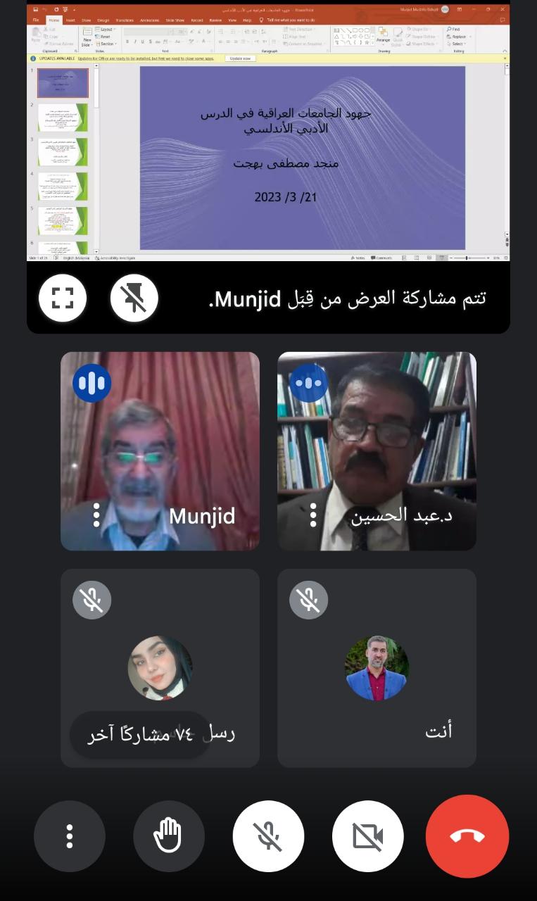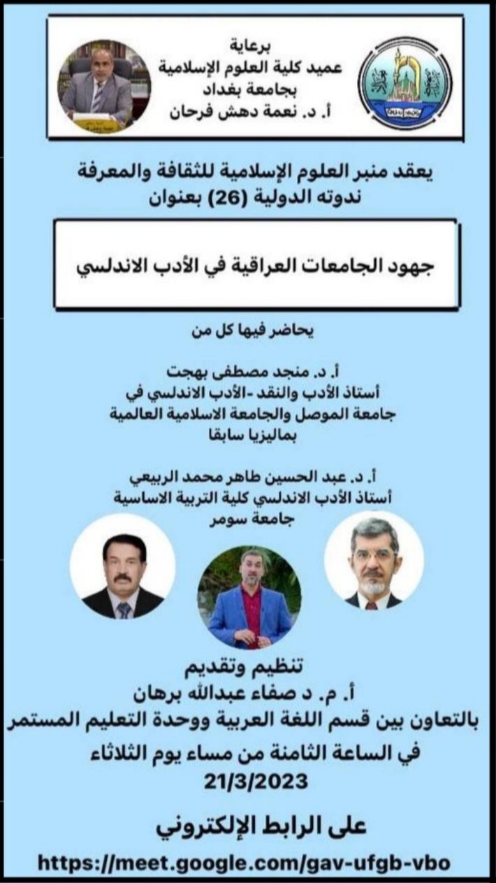 عقد منبر العلوم الإسلامية للثقافة والمعرفة ندوته الدولية السادسة والعشرين تحت عنوان (جهود الجامعات العراقية في الأدب الأندلسي)، استضاف فيها الأستاذ الدكتور منجد مصطفى بهجت من جامعة الموصل والجامعة الإسلامية بماليزيا سابقا والأستاذ الدكتور عبد الحسين طاهر من جامعة سومر بميسان، وادارها الدكتور صفاء عبدالله برهان من قسم اللغة العربية.