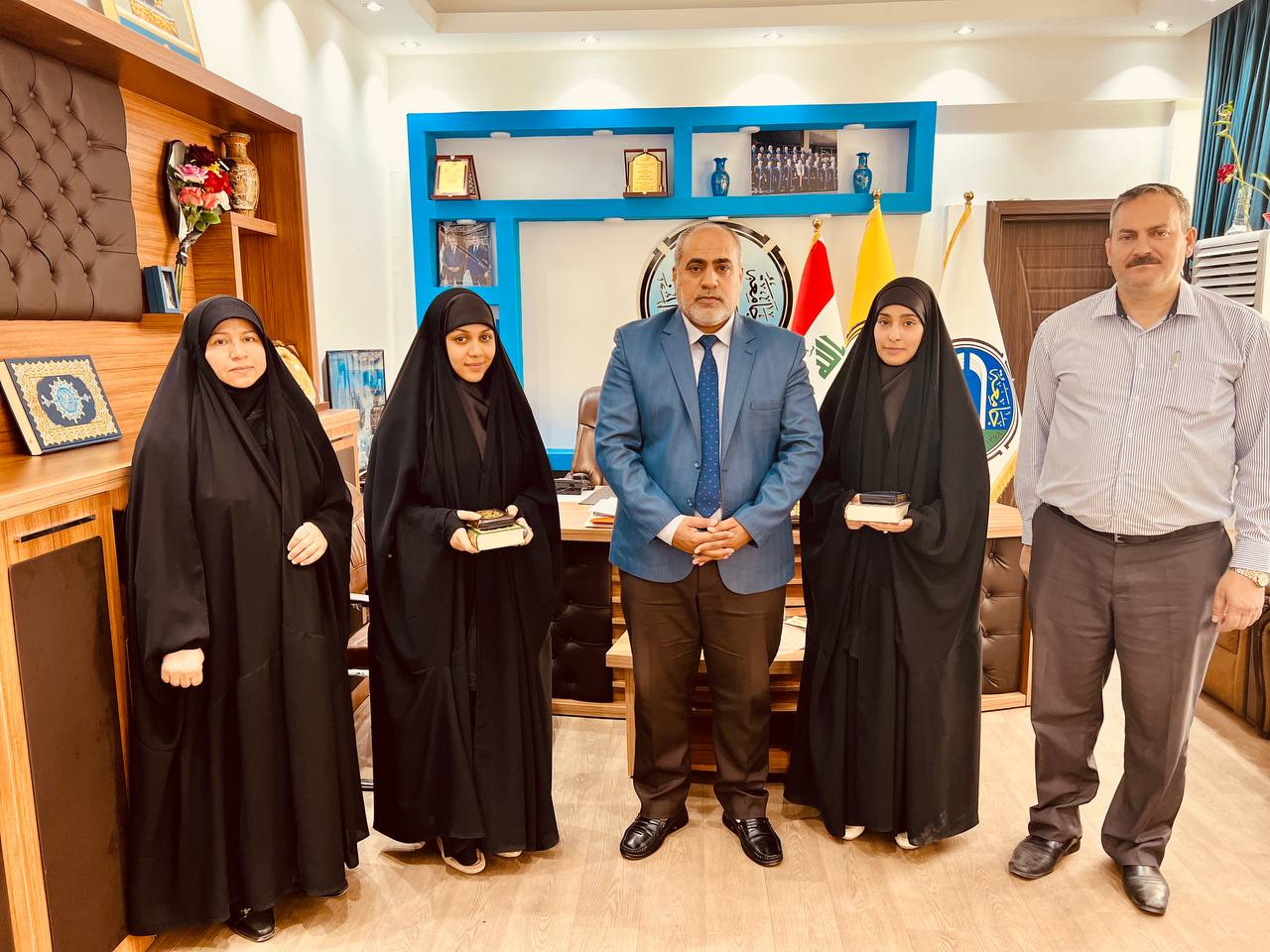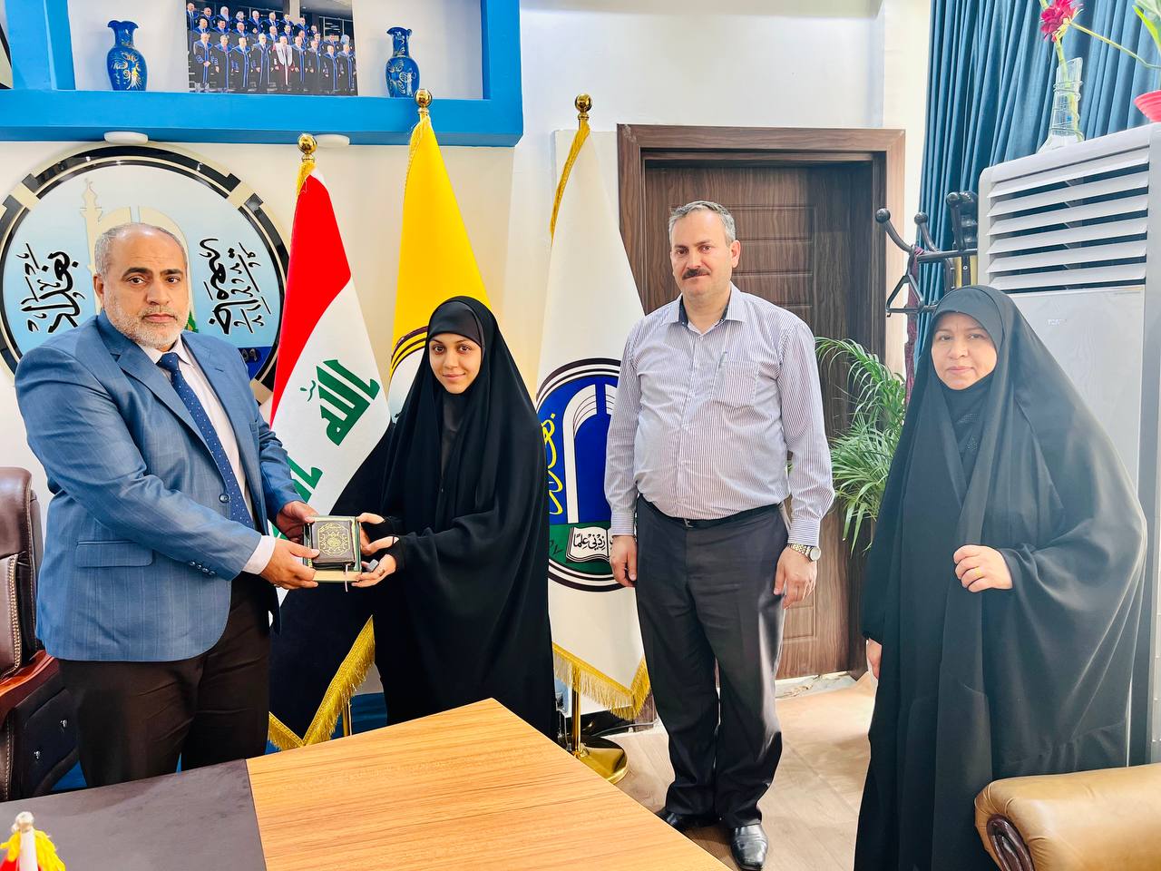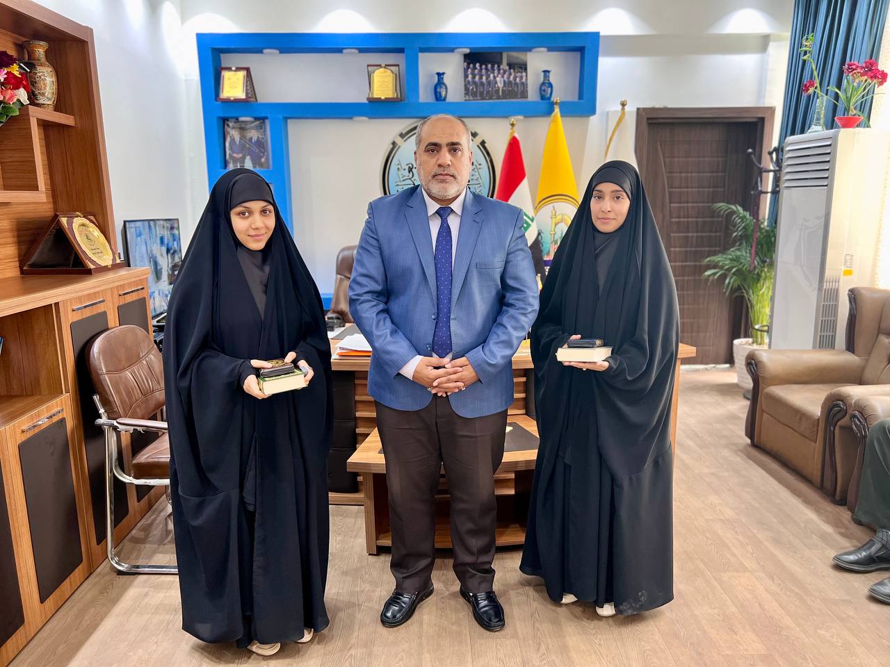 كرم عميد كلية العلوم الاسلامية بجامعة بغداد الاستاذ الدكتور نعمة دهش فرحان الطالبتين الفائزتين في مهرجان روح النبوة الثقافي بكتاب شكر وتقدير ونسخة من كتاب القران الكريم.