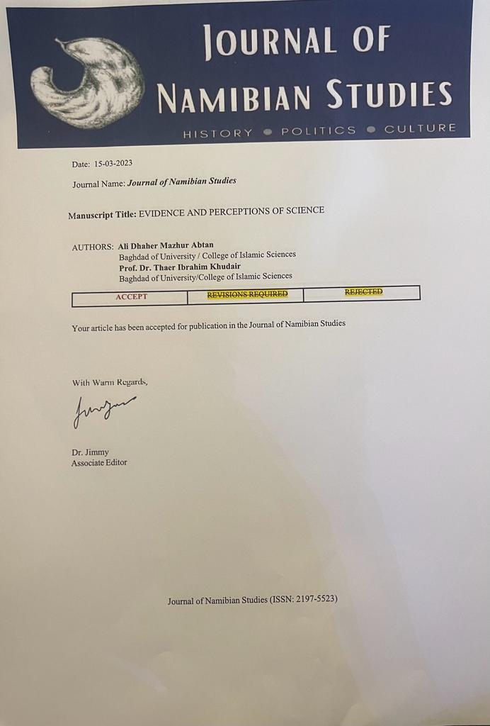 نُشر للدكتور ثائر ابراهيم التدريسي بقسم العقيدة الاسلامية في كلية العلوم الاسلامية بجامعة بغداد بحث مشترك مستل مع طالب الماجستير علي ظاهر مظهور بعنوان (ادلة العلم وتصوراته)في مجلةJournal of Namibian Studies : History Politics Culture: Vol. 33 (2023): Special Issue 2.) التي تدخل ضمن مستوعبات سكوباس .