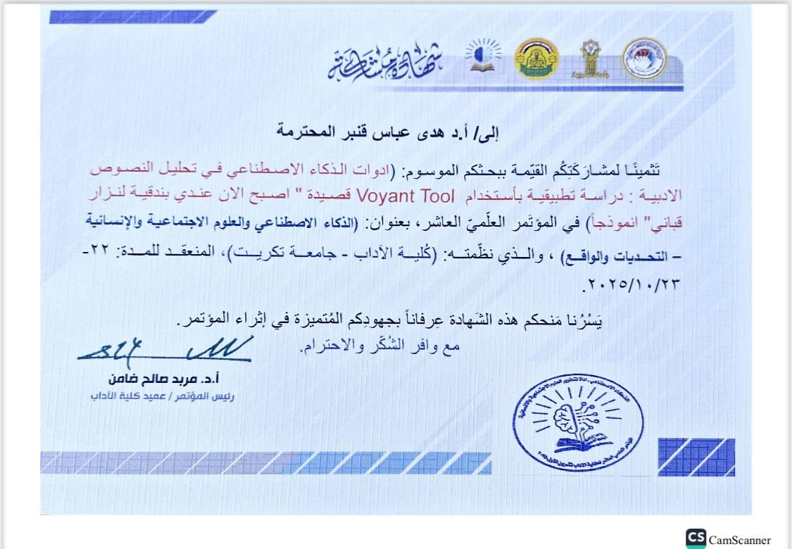 وفي ختام فعاليات المؤتمر، منحت اللجنة المنظمة الدكتورة قنبر شهادة تقديرية تثمينًا لمشاركتها العلمية المتميزة.