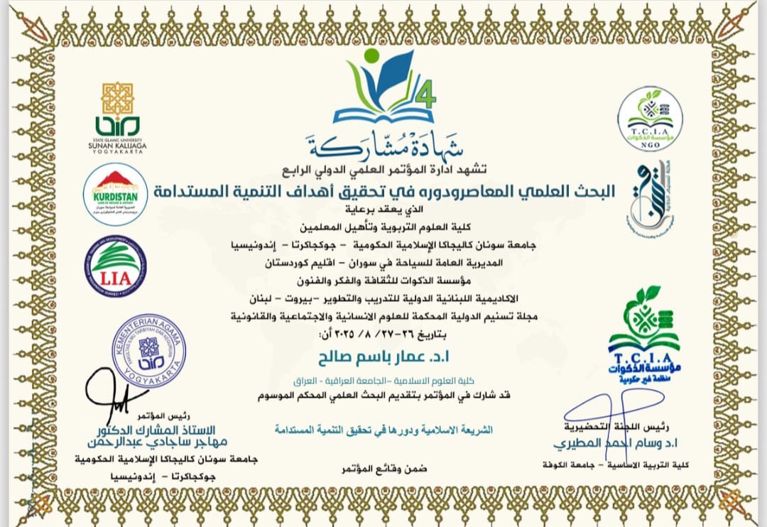 شارك الأستاذ الدكتور عمار باسم صالح التدريسي في كلية العلوم الإسلامية بجامعة بغداد في فعاليات المؤتمر العلمي الدولي الرابع الموسوم “البحث العلمي المعاصر ودوره في تحقيق أهداف التنمية المستدامة” الذي انعقد بمشاركة نخبة من الأكاديميين والباحثين من جامعات عراقية وعربية ودولية.