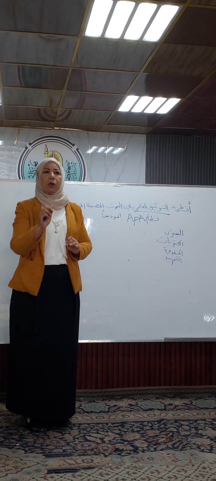 أُقيمت الورشة على قاعة الفراهيدي في قسم اللغة العربية وقدمَتها الدكتورة هدىناجي حيث تناولت بالشرح المفصّل معايير وآليات التوثيق وفق نظام APA وأهميته في رفع مستوى جودة البحوث الأكاديمية.