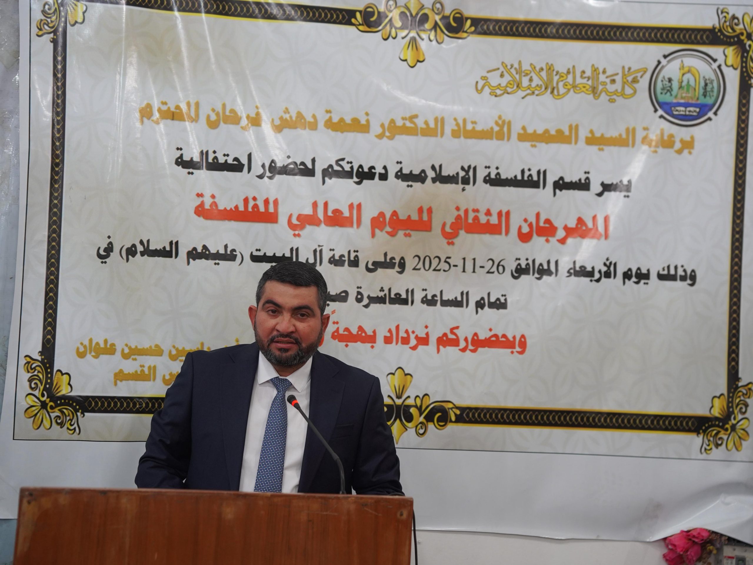 احتفى قسم الفلسفة في كلية العلوم الإسلامية بجامعة بغداد باليوم العالمي للفلسفة من خلال تنظيم مهرجان ثقافي موسّع جمع نخبة من الأساتذة والباحثين والطلبة في فعالية جسّدت حضور الفكر الفلسفي ودوره في تعزيز القيم الإنسانية والحوار المعرفي.وافتُتِح المهرجان بحضور عميد الكلية الاستاذ الدكتور نعمة دهش فرحان الذي ألقى كلمة عبّر فيها عن اعتزازه بالجهود العلمية والثقافية التي يبذلها قسم الفلسفة مؤكدًا أن الفلسفة هي ركيزة أساسية في بناء الوعي الأكاديمي المستنير لما تحمله من قدرة على تنمية التفكير النقدي وترسيخ ثقافة التساؤل والحوار البنّاء داخل الحرم الجامعي.