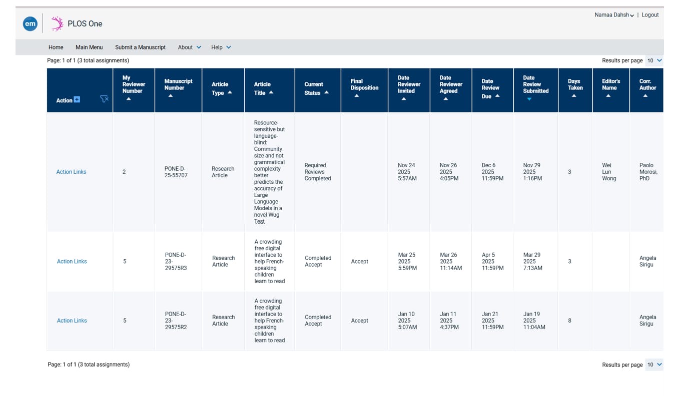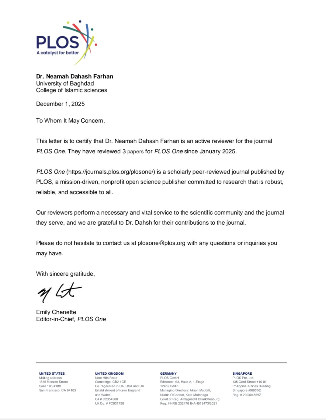 حصل عميد كلية العلوم الإسلامية في جامعة بغداد الأستاذ الدكتور نِعمة دهش فرحان على تأييد رسمي من مجلة PLOS ONE العالمية المرموقة يؤكد قيامه بتحكيم ثلاثة بحوث علمية منشورة ضمن مجلات مصنّفة في مستوعبات سكوباس Q1 وذلك منذ يناير 2025.