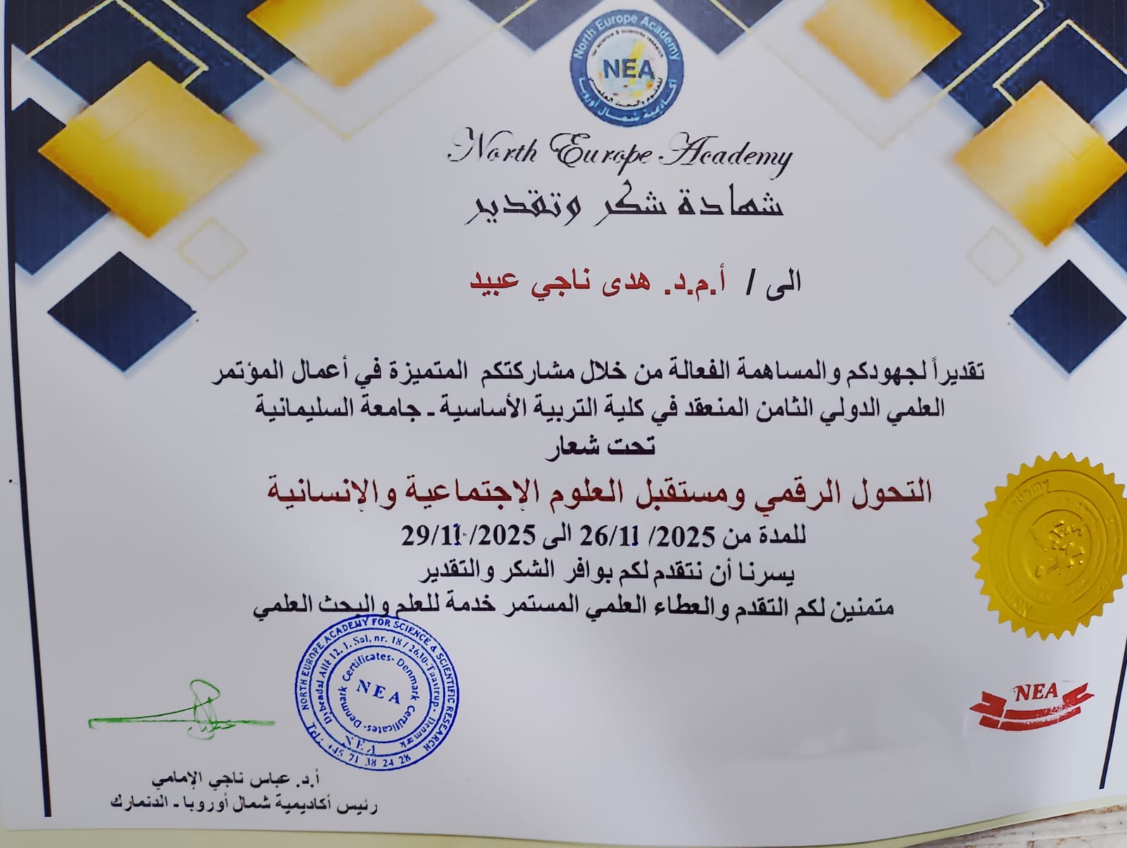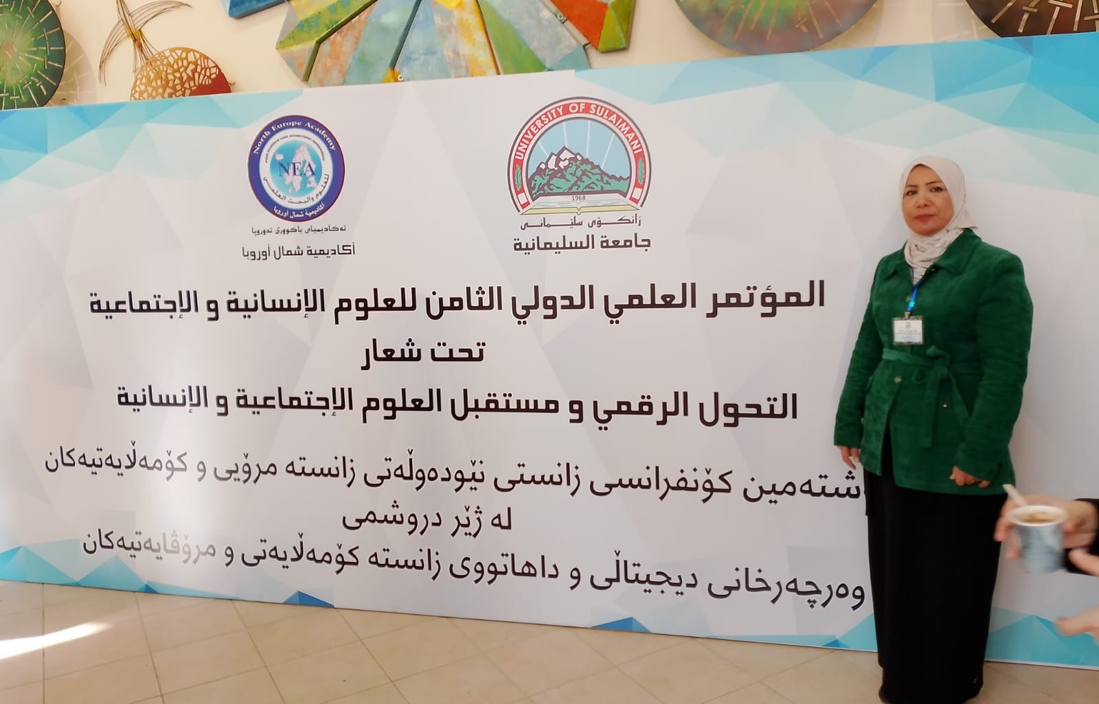 شاركت الأستاذ المساعد الدكتورة هدى ناجي عبيد التدريسية في قسم اللغة العربية في أعمال المؤتمر العلمي الدولي الثامن للعلوم الإنسانية والاجتماعية الذي نظمته أكاديمية شمال أوروبا – الدنمارك بالتعاون مع جامعة السليمانية وجامعة السلطان مولاي سليمان ونخبة من الجامعات العربية وذلك بمشاركة واسعة من الباحثين والأكاديميين من مختلف الدول.