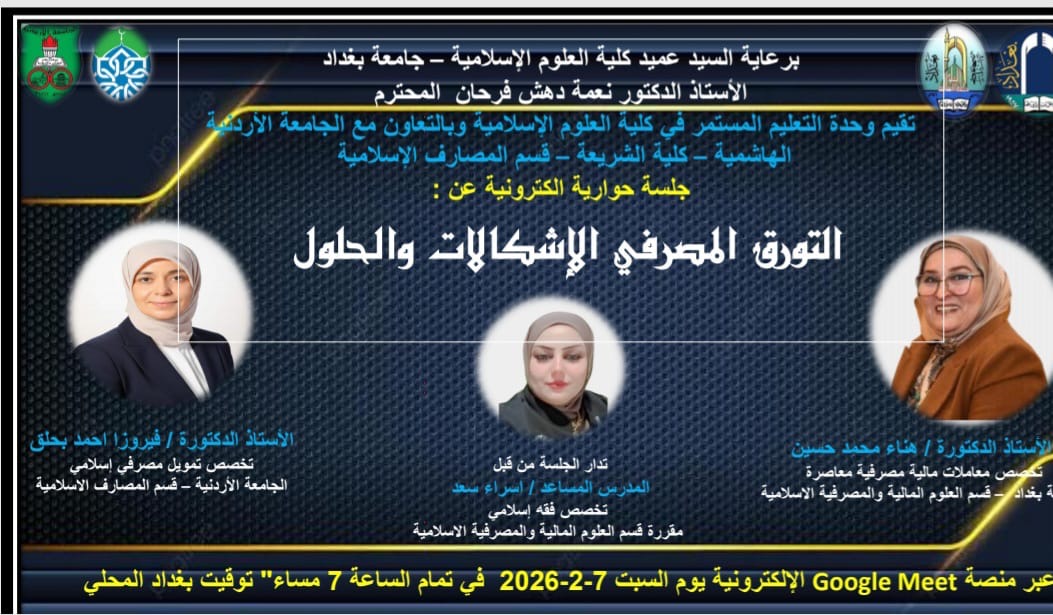 برعاية عميد كلية العلوم الإسلامية في جامعة بغداد الأستاذ الدكتور نعمة دهش فرحان نظّمت وحدة التعليم المستمر في كلية العلوم الإسلامية وبالتعاون مع الجامعة الاردنية الهاشمية – كلية الشريعة -قسم المصارف الإسلامية ورشة إلكترونية موسومة بعنوان “التورق المصرفي: الإشكالات والحلول” وذلك عبر منصة Google Meet وبمشاركة نخبة من الأكاديميات المتخصصات في مجالات العلوم المالية والمصرفية الإسلامية.