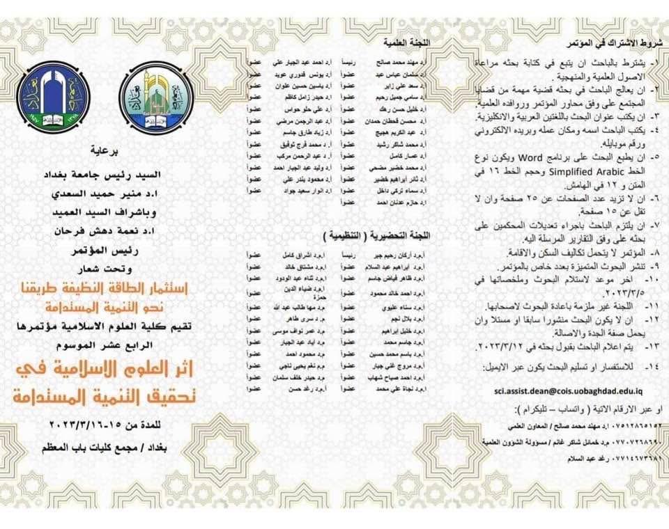 وقائع مؤتمر كلية العلوم الاسلامية الرابع عشر (اثر العلوم الاسلامية في تحقيق التنمية المستدامة) المنعقد بتاريخ ١5-١6 /٢٠٢٣/3