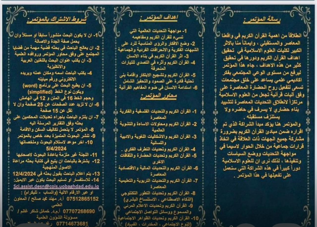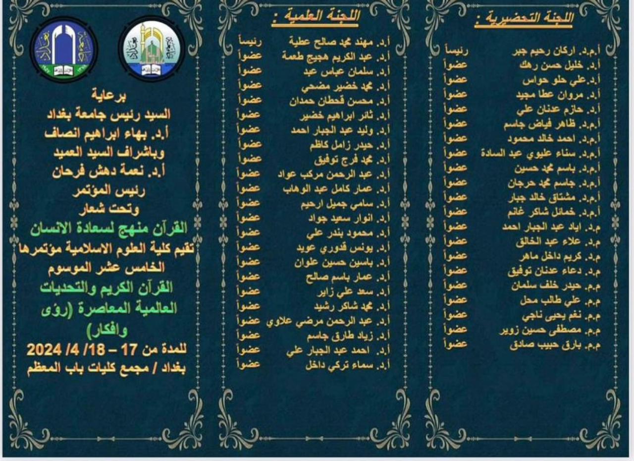 المؤتمر الخامس عشر لكلية العلوم الاسلامية (القرآن الكريم والتحديات العالمية المعاصرة (رؤى وافكار)) المنعقد بتاريخ 17-18 /2024/4
